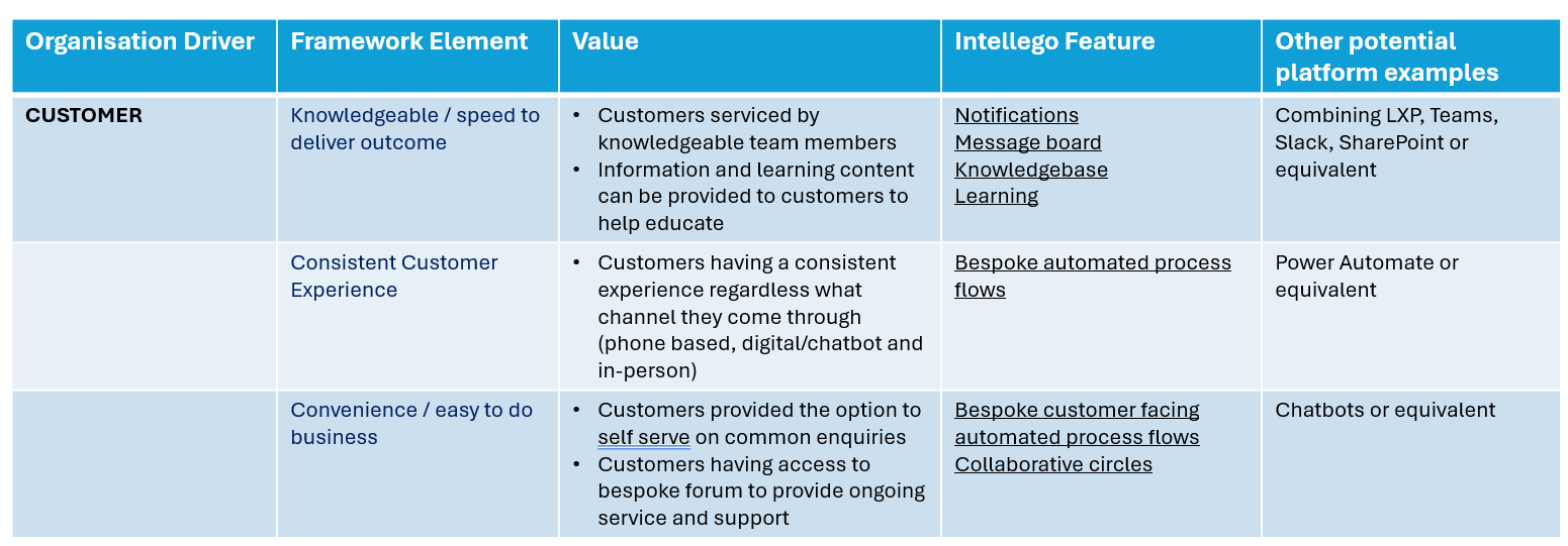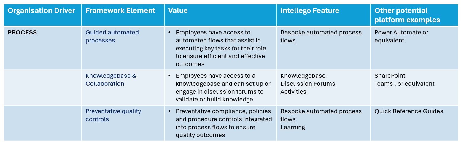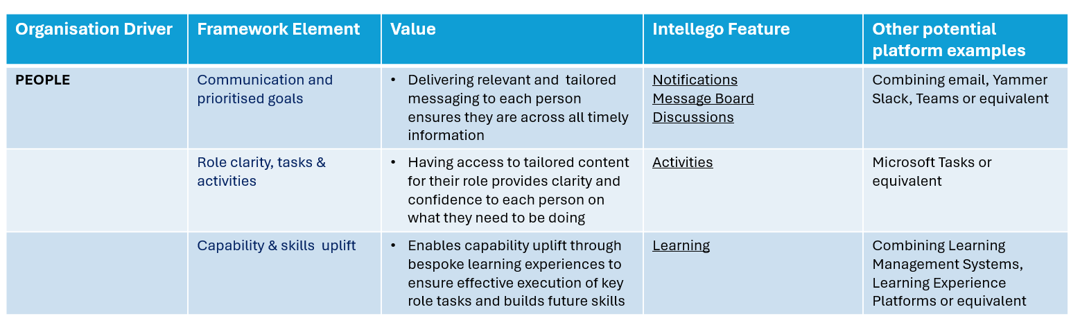 While we use intellego as the platform to execute the solution, the BEAM framework can be adapted and applied in any organisation using a variety of tools and platforms as shown in the tables below.